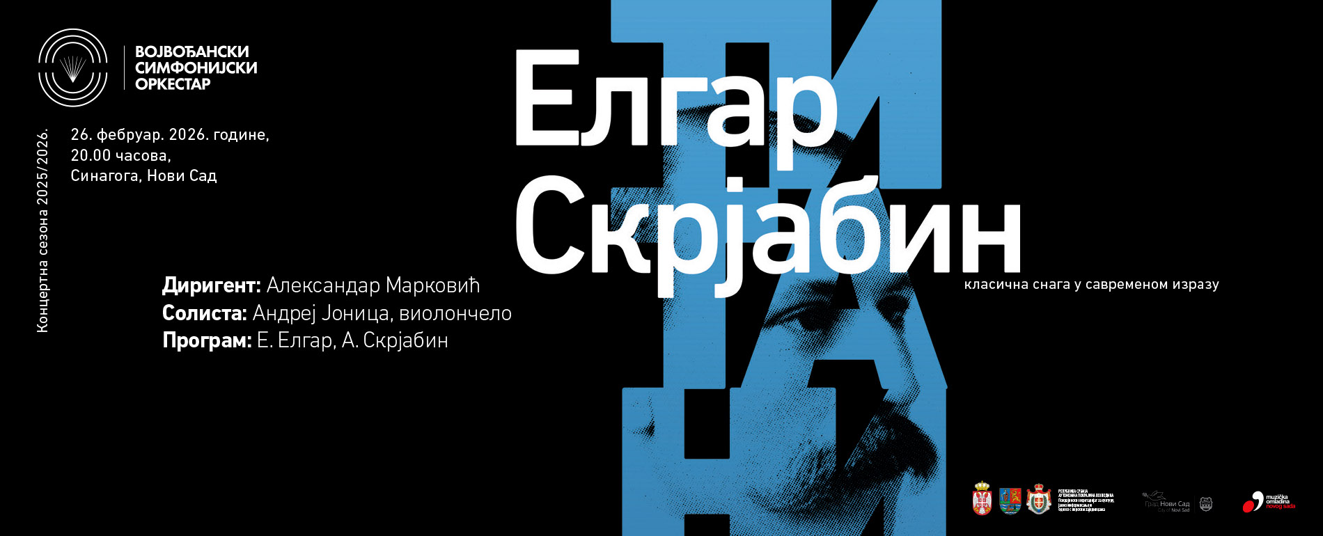 Vojvođanski simfonijski orkestar pod vođstvom svog šefa-dirigenta, maestra Aleksandra Markovića otvara drugi deo tekuće sezone s izuzetnim gostujućim solistom i snažnim delima. Tako će se orkestru pridružiti ovaj put mladi violončelista Andrej Jonica, dobitnik zlatne medalje XV Međunarodnog takmičenja „Čajkovski“, 2015. godine i laureat na prestižnim „ARD“, „Hačaturijan“ i „Emanuel Fojerman“ takmičenjima. Na programu su Koncert za violončelo i orkestar u e-molu Edvarda Elgara i Simfonija br. 2 u c-molu Aleksandra Skrjabina.